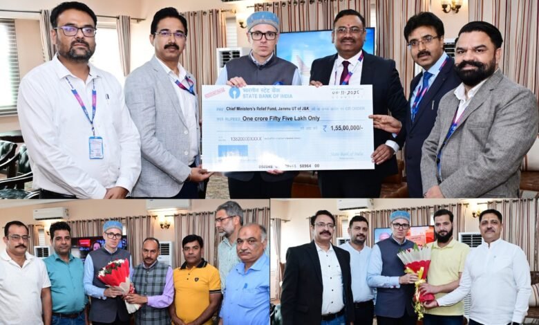 JAMMU, NOVEMBER 3: A deputation of the State Bank of India (SBI) today called on Chief Minister Omar Abdullah at the Civil Secretariat, Jammu, and presented a cheque of ₹1.55 crore as a contribution to the Chief Minister’s Relief Fund.