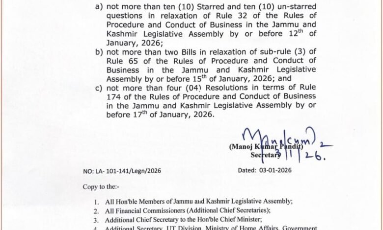 “I, Manoj Sinha, Lieutenant Governor of the Union Territory of Jammu and Kashmir, in exercise of the powers conferred upon me under Section 18 (1) of the Jammu and Kashmir Reorganisation Act, 2019, do hereby summon the Legislative Assembly for the Union Territory of Jammu and Kashmir to meet at Jammu on Monday, the 2nd of February, 2026 at 10:00 A.M.,” reads the summon, a copy of which is with news agency—Kashmir News Observer (KNO)