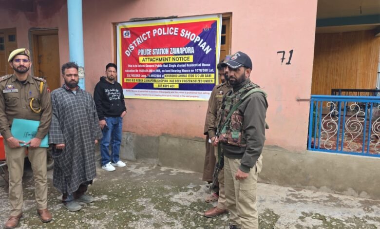 Shopian, April 05:- As part of its ongoing drive against narcotics related activities, J&K Police in Shopian have attached a single-storey residential house valued at ₹16,20,444/- under Khasra No. 1070/360, belonging to Khurshid Ahmad Itoo a resident of Takiya Reban Zainapora.