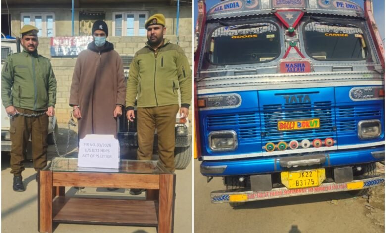 Pulwama, Jan 6, : Pulwama Police on Tuesday intercepted a truck during naka checking at Litter, leading to the recovery of a substantial quantity of heroin-like substance valued at lakhs of rupees in the international market, officials said.