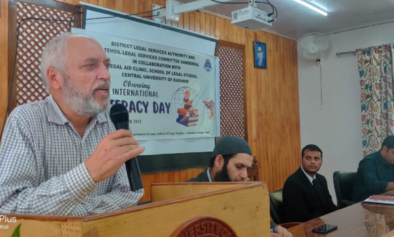Ganderbal, Sept 8: Department of Law, School of Legal Studies (SLS), Central University of Kashmir (CUK), in collaboration with the District Legal Services Authority and Tehsil Legal Services Committee, Ganderbal, observed International Literacy Day under the theme “Promoting Literacy for a World in Transition: Building the Foundation for Sustainable and Peaceful Societies”, at varsity’s Tulmulla campus here on Friday.