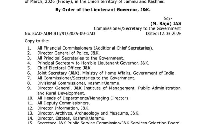 The order states that the holiday will now be observed on March 13 across the Jammu and Kashmir in view of the observance of Jumat-ul-Vida, the last Friday of the holy month of Ramazan.