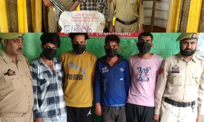In Kulgam, a police party headed by In-charge Police Post Navyug Tunnel Qazigund during its routine patrolling near Navyug Tunnel Qazigund intercepted a suspicious vehicle (Santro) bearing registration No. CH03R-3855 with 04 persons onboard. During search of the vehicle, 830 grams of Charas like contraband substance was recovered. They have been identified as Sher Aalam Khan son of Nawab Khan & Sohail Ahmad Khan son of Shahzad Ahmad Khan, both residents of Dadoo Marhama, Anantnag, Ashraf Ali son of Noor Mohammad resident of Dandal Udhampur and Makhan Lal son of Hans Raj resident of Ossu Udhampur. They have been arrested and shifted to police station where they remain in custody. Vehicle used in commission of crime was also seized.
