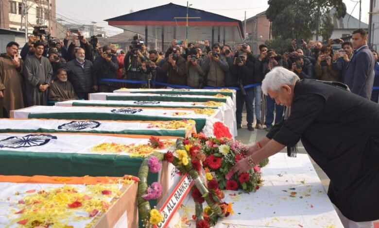 SRINAGAR, NOVEMBER 15: Lieutenant Governor Shri Manoj Sinha laid a wreath and offered his tributes to the Police Personnel, Revenue Officials and a Civilian who lost their lives in an accidental blast at Nowgam Police Station last night. He also met the bereaved families and conveyed his condolences.