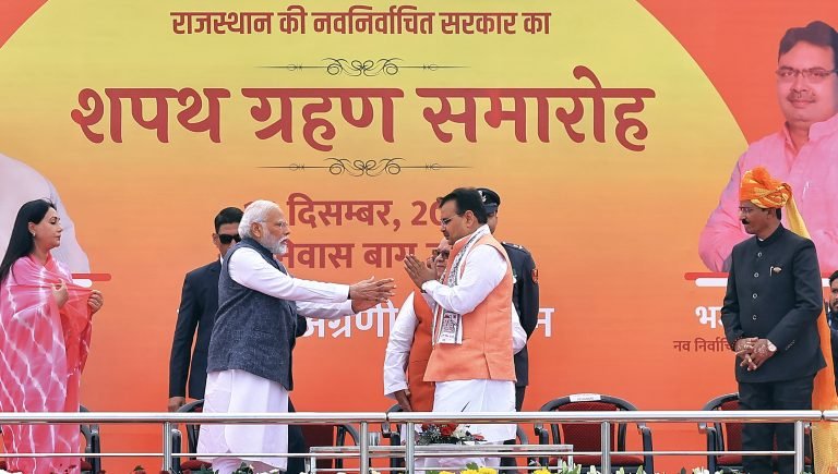 Jaipur, Dec 15: First-time MLA Bhajan Lal Sharma was sworn in as the chief minister of Rajasthan at a ceremony attended by Prime Minister Narendra Modi and the BJP’s top leadership on Friday, 12 days after the party ousted the Congress in the assembly polls.