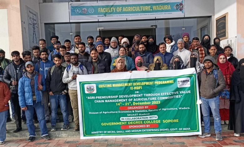 The training, ‘Agripreneurship Development Through Effective Value Chain Management of Agricultural Commodities’ is organised by SKUAST-K’s Division of Agricultural Economics & Statistics, Faculty of Agriculture, in collaboration with Govt. Degree College, Sopore under the sponsorship of the Union Ministry of Micro, Small and Medium Enterprises.