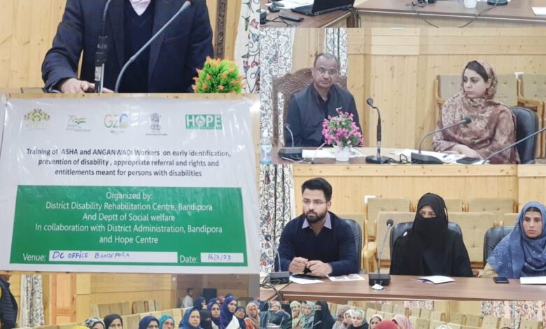 BANDIPORA, MARCH 16: On the overall guidance of Deputy Commissioner Bandipora, the District Disability Rehabilitation Centre in collaboration with District Administration Bandipora on Thursday organised a daylong training cum workshop for Asha, Anganwadi workers and supervisors for early identification, prevention and rehabilitation of specially abled persons.