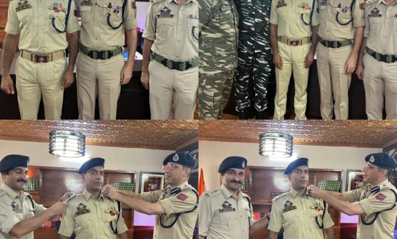 Senior Superintendent of Police Budgam Shri Al-Tahir Gilani-JKPS adorned DySP Shri Aijaz Ahmad Malik-JKPS with the new rank of Superintendent of Police. The event was also attended by Addl. SP Budgam Gowhar Ahmad Khan-JKPS and other officers.