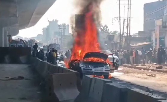 According to eyewitnesses, the driver noticed smoke emanating from the vehicle while driving and immediately stopped the car on the roadside. He managed to come out safely, but within moments, flames engulfed the vehicle. Locals said that a couple of blast like sounds were also heard as the fire intensified.