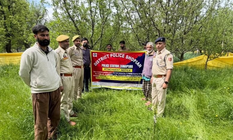 Shopian, April 20:- As part of its continued crackdown on narcotics-related activities, Police in Shopian have attached an immovable property valued at ₹10,00,000/- belonging to Showkat Ahmad Dar resident of Dachoo Zainapora. The property measuring 10 Marlas falling under Survey No. 62 was identified as having been acquired through proceeds generated from the illegal trade of drugs and narcotics. Accordingly, the said property has been attached in connection with FIR No. 76/2025 of Police Station Zainapora.