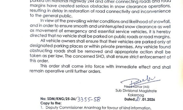 Kokernag, Jan 21 : In view of prevailing winter conditions and the likelihood of snowfall, the Sub Divisional Magistrate (SDM) Kokernag has imposed a ban on parking of vehicles on National Highway-244 and other connecting roads to ensure smooth snow clearance and uninterrupted movement of essential services.