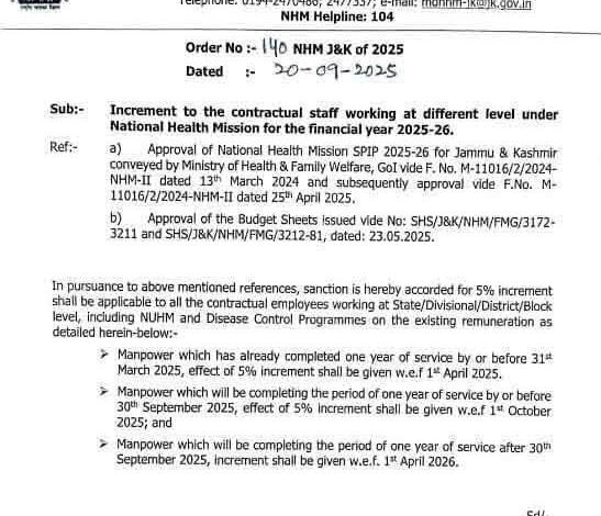 The National Health Mission (NHM), Jammu and Kashmir, has approved a 5% increment in the remuneration for its contractual employees across different levels for the financial year 2025-26.