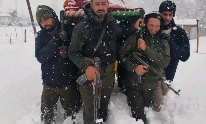 An official said police personnel from Police Station Vilgam swung into action after receiving an SOS regarding a woman requiring urgent medical assistance. Due to heavy snowfall and snow-covered paths, vehicular movement was not possible in the area.