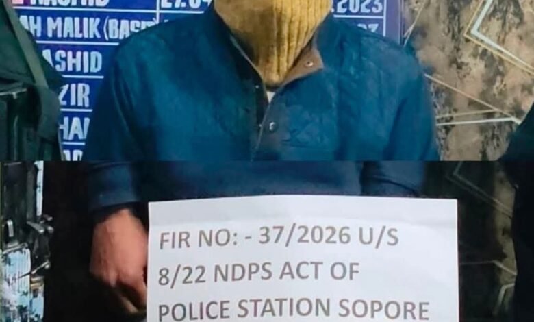 A police party of Police Post Fruit Mandi, intercepted a suspicious individual coming from Chinar Crossing towards Fruit Mandi. He has been identified as Mansoor Ahmad Bhat, son of Late Abdul Ahad Bhat, resident of Khawaja Gilgit Batpora, Sopore. Upon personal search, Spasmoproxyvon Plus capsules were recovered and seized as per due procedure. The accused was arrested and accordingly, a case vide FIR No. 37/2026 has been registered at Police Station Sopore and investigation has been initiated.