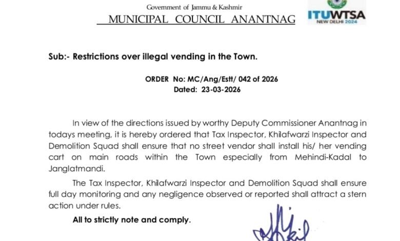 Anantnag, Mar 24: Municipal Council Anantnag has imposed strict restrictions on illegal street vending across the town, particularly on key roads, following directions from the Deputy Commissioner.