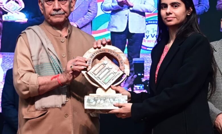 REASI, JANUARY 25: The Lieutenant Governor of Jammu and Kashmir, Manoj Sinha today felicitated the Deputy Commissioner and District Election Officer (DEO) Reasi, Nidhi Malik, with an Appreciation Award during the 16th National Voters’ Day celebrations held at the Convention Centre, Jammu.