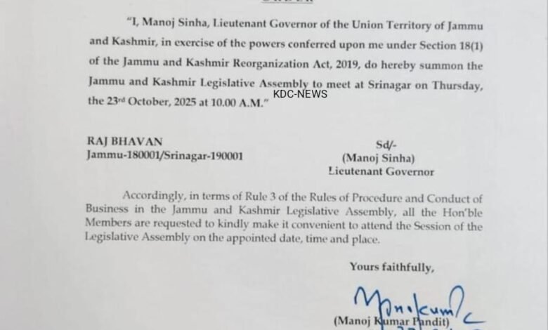 “The Jammu and Kashmir Legislative Assembly is summoned to meet on October 23, 2025, at 10:00 A.M., in exercise of powers under Section 18 (1) of the Jammu and Kashmir Reorganization Act, 2019,” the LG said in his official order.