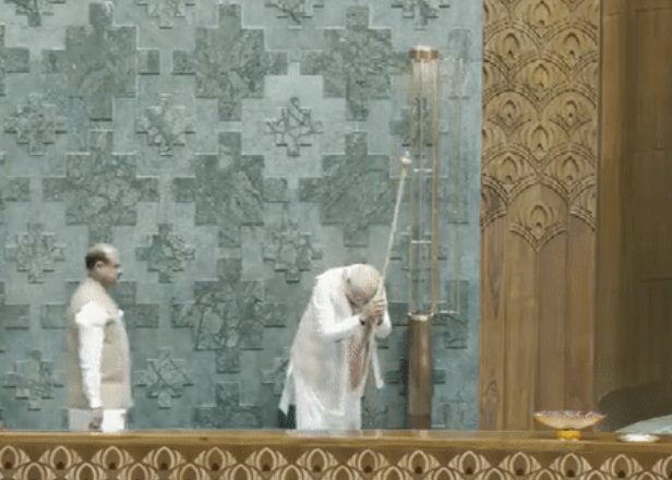 The ceremony has begun with a traditional ‘pooja’ with Vedic rituals which will continue for an hour. Lok Sabha Speaker Om Birla was also present with along with PM Modi during the pooja.