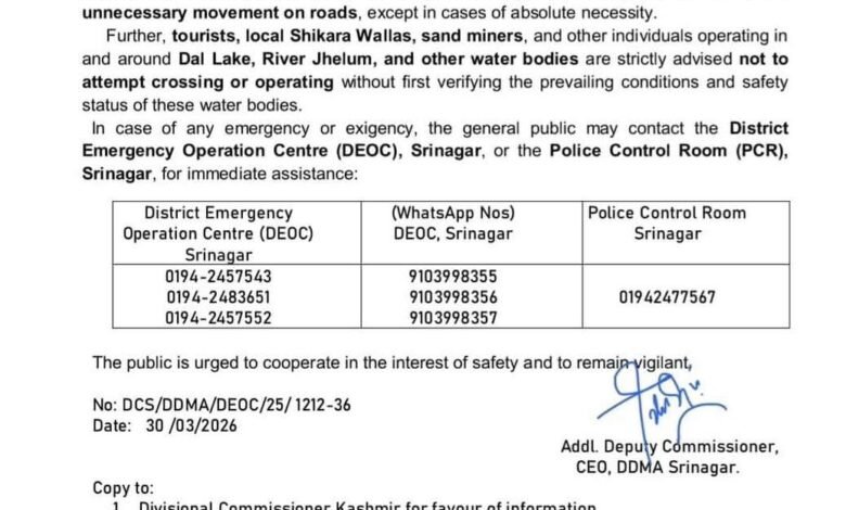 *Public urged to avoid unnecessary travel; warnings issued for Dal Lake, Jhelum activities till March 31*