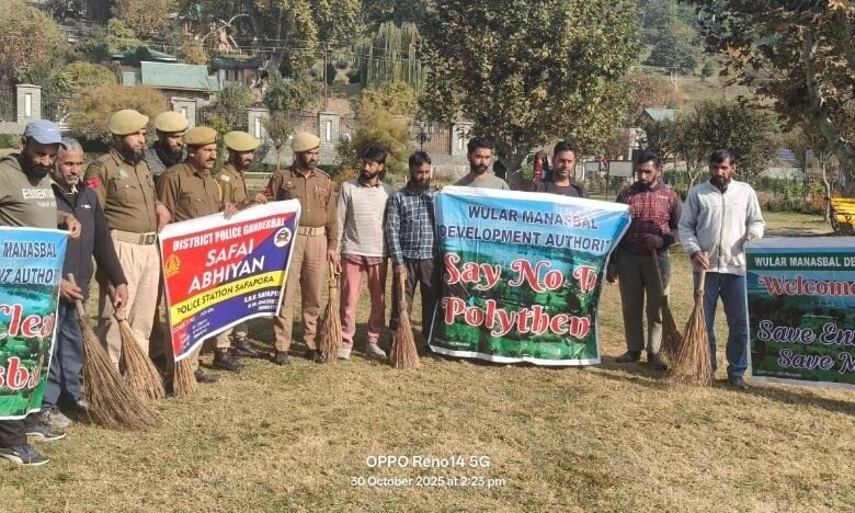 Manasbal(GANDERBAL), OCTOBER 30: The Wullar Manasbal Development Authority (WMDA), in collaboration with the District Police Ganderbal, today conducted a mega sanitation drive around the picturesque Manasbal Lake to promote cleanliness, environmental conservation, and community awareness among people.