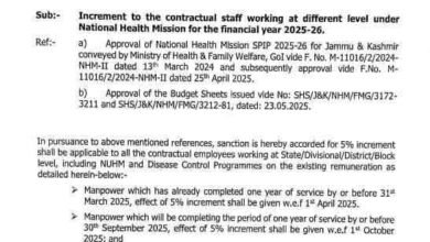 The National Health Mission (NHM), Jammu and Kashmir, has approved a 5% increment in the remuneration for its contractual employees…
