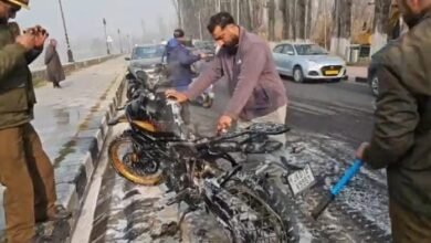 Srinagar,Dec 5, A motorcycle caught fire on Boulevard Road near SKICC on Friday, prompting an immediate response from fire and…